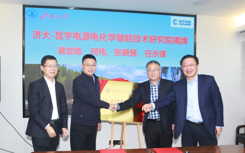 签约揭牌仪式上,颜梅与东营昆宇电源科技有限公司总经理助理岳鹏签署了济大-昆宇电源电化学储能技术研究院共建协议,黄加栋、何伟、张晓慧、任永锋共同为研究院揭牌。