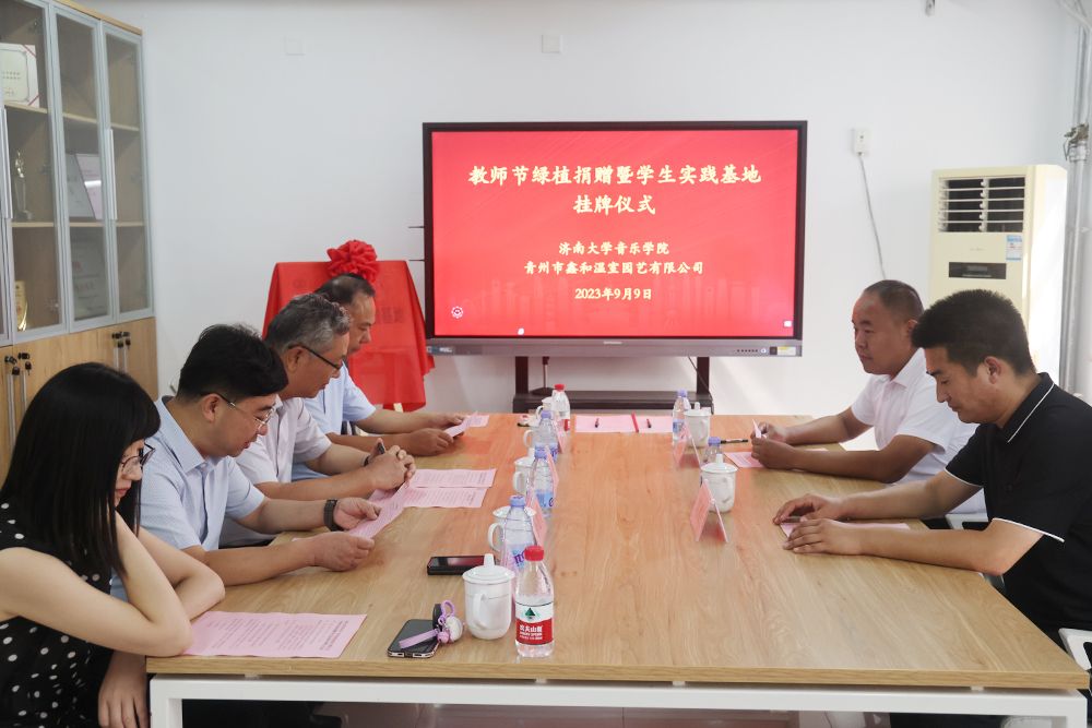 9月9日,音乐学院与青州鑫和温室园艺有限公司举行教师节绿植捐赠暨大学生实践基地挂牌仪式。济南大学党委常委、副校长张勇,青州鑫和温室园艺有限公司董事长赵远涛、青州鑫和温室园艺有限公司经理刘建行、济南大学音乐学院班子全体成员及部分教师代表参加此次活动。活动由音乐学院党委书记孙翔玲主持。