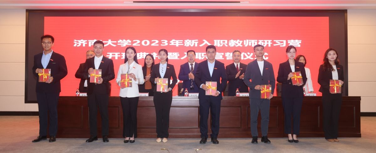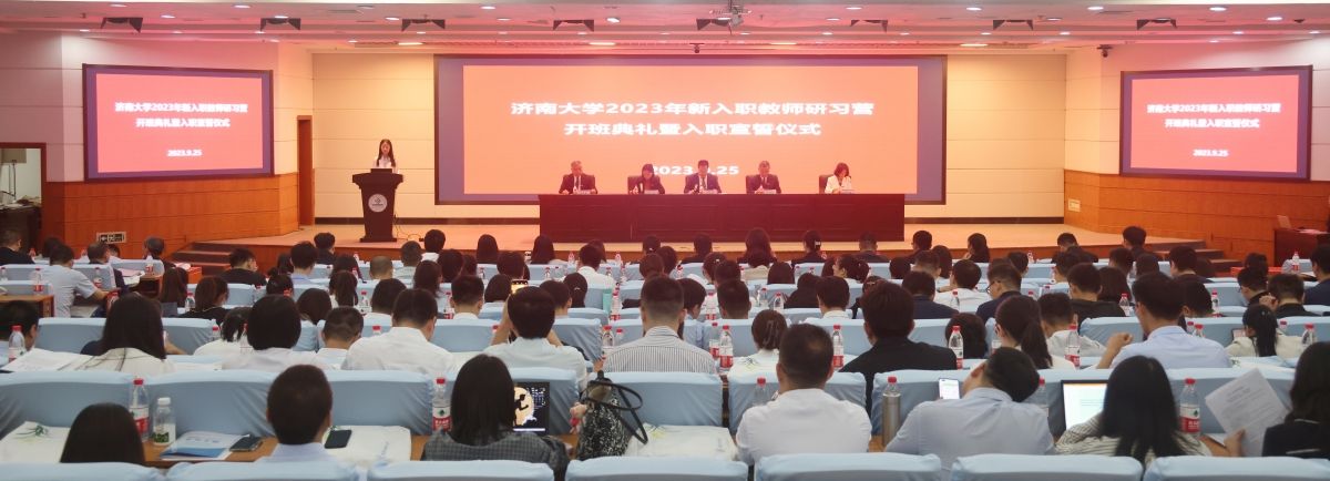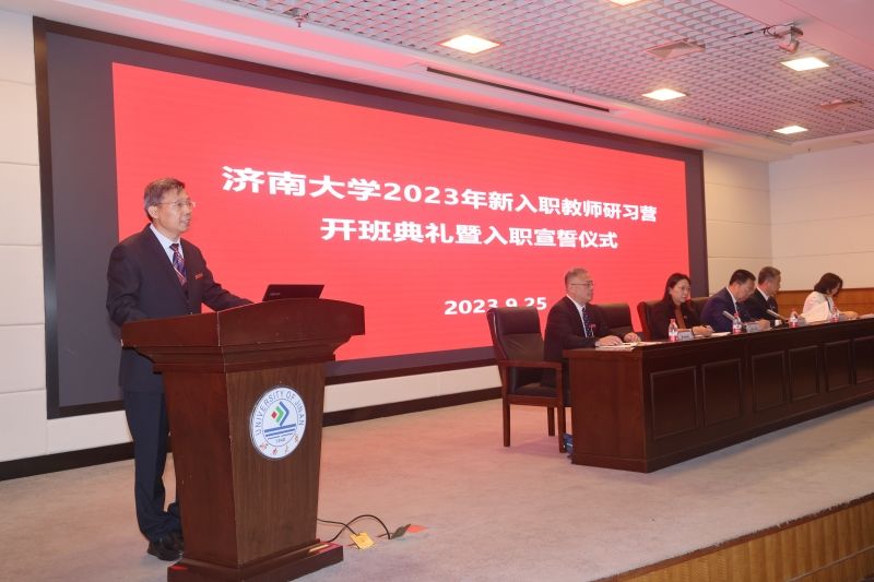 9月25日,济南大学2023年新入职教师研习营开班典礼暨入职宣誓仪式在学校第一学术报告厅举行。学校党委副书记、校长刘宗明出席活动并讲话,党委副书记查玉喜,党委常委、副校长商华,党委常委、副校长王霞,党委常委、副校长黄加栋,老教师代表、全国高校黄大年式教师团队核心成员黄世峰教授,学生工作部(处)、教师工作部 教师发展中心、人力资源处、教务处、科技处、社科处等部门负责人,各教学学院院长,2023年新入职教师研习营全体学员以及相关人员参加活动,仪式由副校长商华主持。
