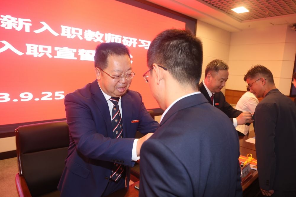 仪式开始,校领导为新入职教师代表佩戴校徽并赠送了书籍。