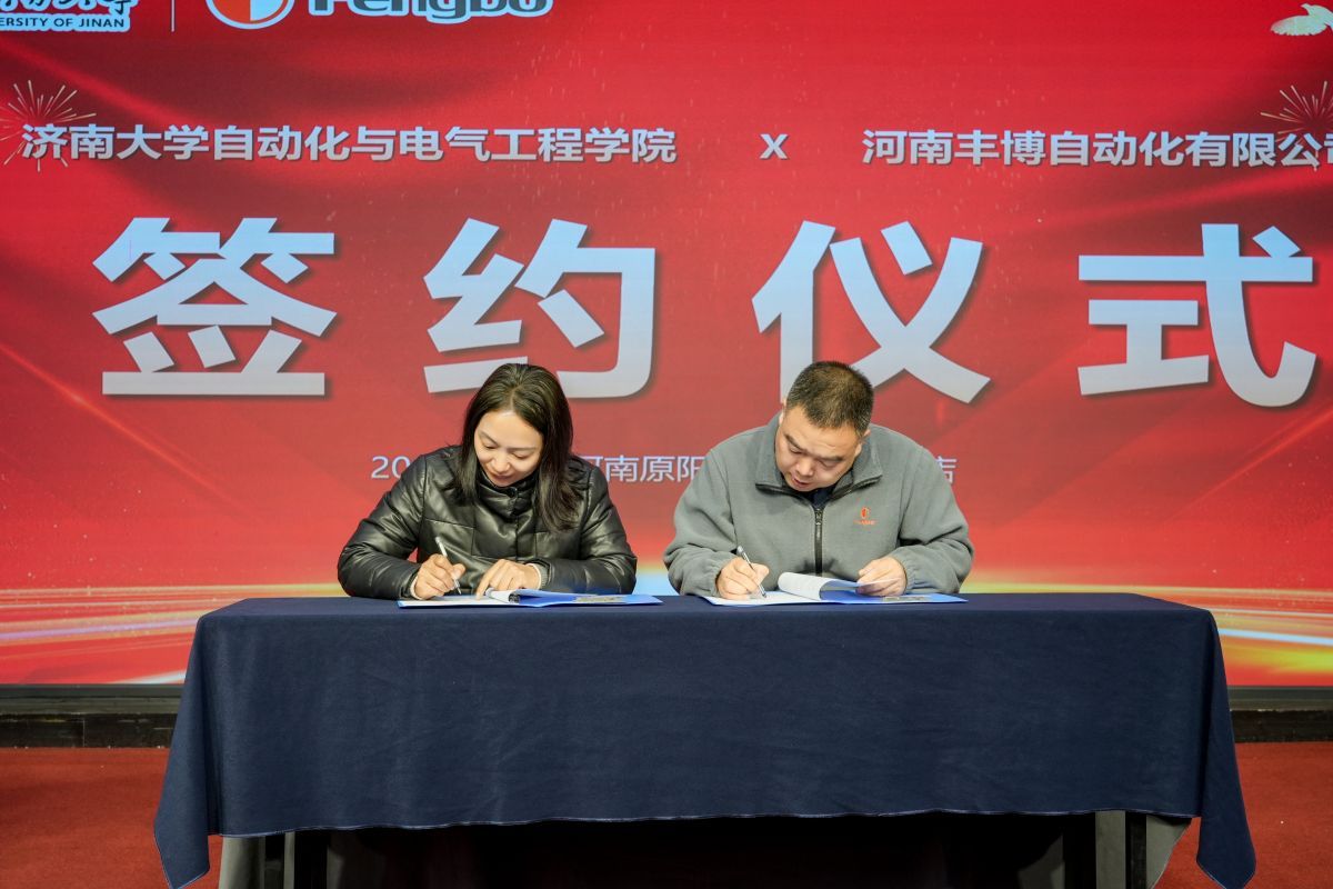 丰博计量集团有限公司相关人员向与会校友们介绍了丰博集团与济南大学校企合作发展情况。济南大学自动化与电气工程学院与河南丰博自动化有限公司就职工培训基地、教学实践基地、人才培养及专家库建设签订合作协议。