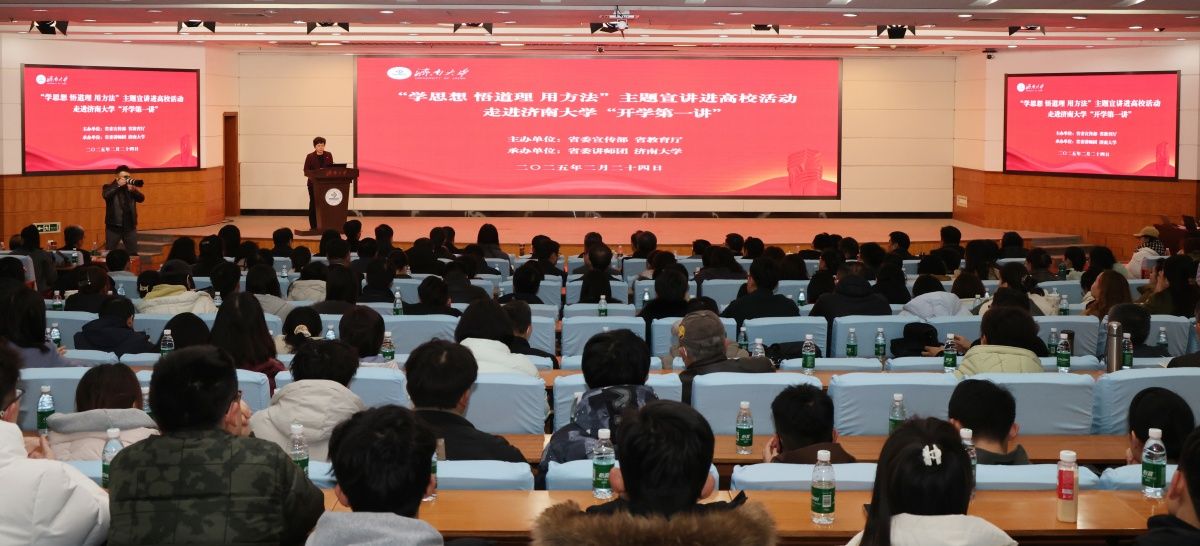 2月24日上午,由省委宣传部、省教育厅联合主办的“学思想 悟道理 用方法”主题宣讲进高校活动全面启动,在济南大学举办“开学第一讲”。省委宣传部副部长、一级巡视员魏长民,省委讲师团团长闫军,省教育厅总督学王志刚,济南大学党委书记刘春华,党委副书记商华,党委常委、副校长李强,省委宣传部、省教育厅有关处室负责人以及济南大学师生代表300余人参加活动。宣讲活动由刘春华主持。