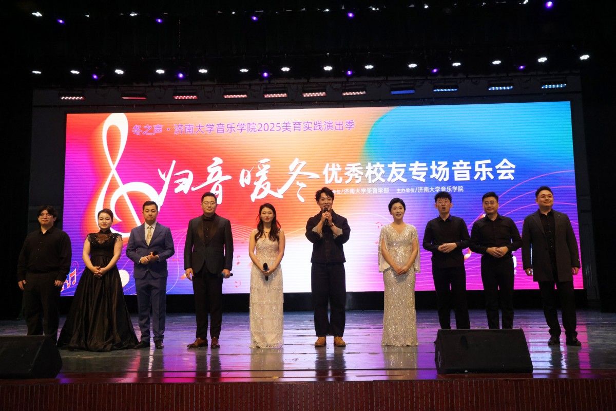 这场优秀校友音乐会不仅是一场温暖震撼的视听盛宴,更是济南大学音乐学院数载深耕、桃李满园的生动缩影,是学院“音和乐谐、德艺双馨”育人理念的璀璨绽放。多年来,音乐学院始终将艺术实践与教学创新相融合,培养出一批批技艺与情怀兼具的优秀人才。他们活跃在音乐教育、舞台表演、文化传播等广阔领域,以专业实力闪耀岗位,以艺术热忱回馈社会,持续印证并推动着学院人才培养体系的完善与超越。我们始终坚信,在美育之光的持续照耀下,济大音乐学子必将在感知美、诠释美、创造美的道路上,不断传承济大精神,以更饱满的激情、更精湛的技艺、更深厚的情怀,谱写属于新时代的华彩乐章,让艺术之魂在时代回响中生生不息。