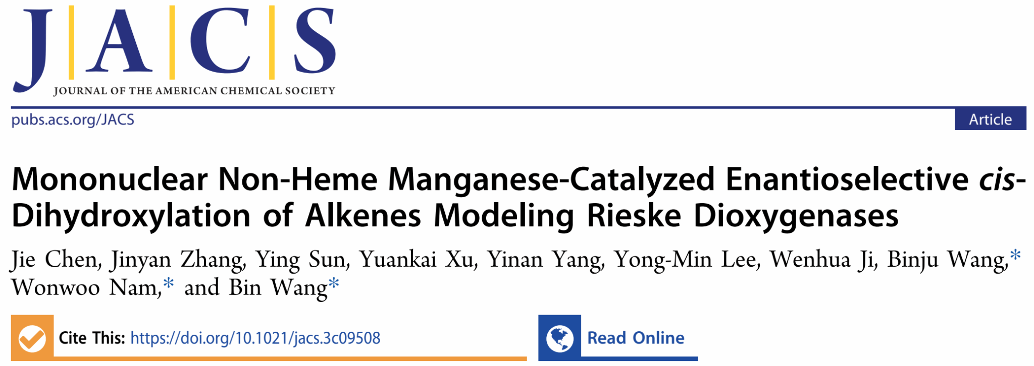 近日,济南大学化学化工学院王斌教授课题组与厦门大学王斌举教授、韩国梨花女子大学Wonwoo Nam教授合作在国际化学领域权威期刊《美国化学会志》(J. Am. Chem. Soc. 2023, DOI:10.1021/jacs.3c09508.)发表了题为“Mononuclear Non-Heme Manganese-Catalyzed Enantioselective cis-Dihydroxylation of Alkenes Modeling Rieske Dioxygenases”的研究论文。