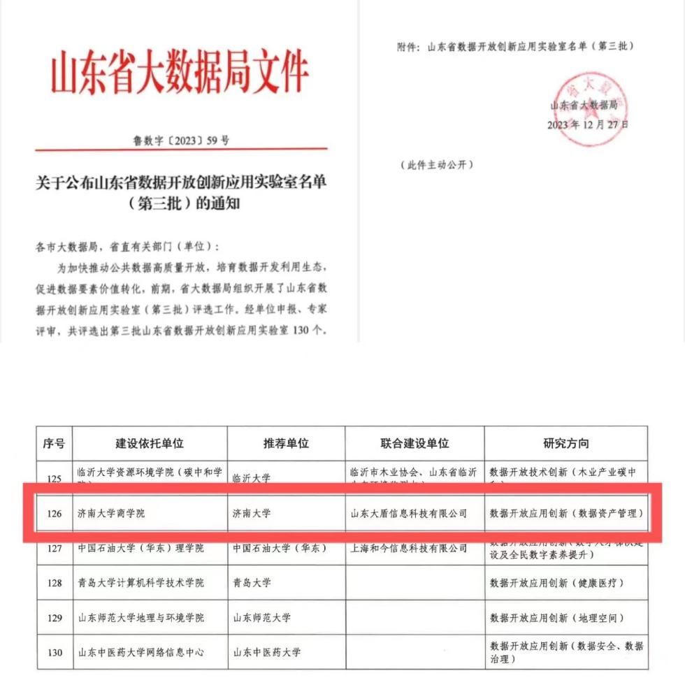 近日,山东省大数据局发布《关于公布山东省数据开放创新应用实验室名单(第三批)的通知》(鲁数字〔2023〕59号),商学院联合山东大盾信息科技有限公司共建的“数据开放应用创新(数据资产管理)实验室”成功入选!