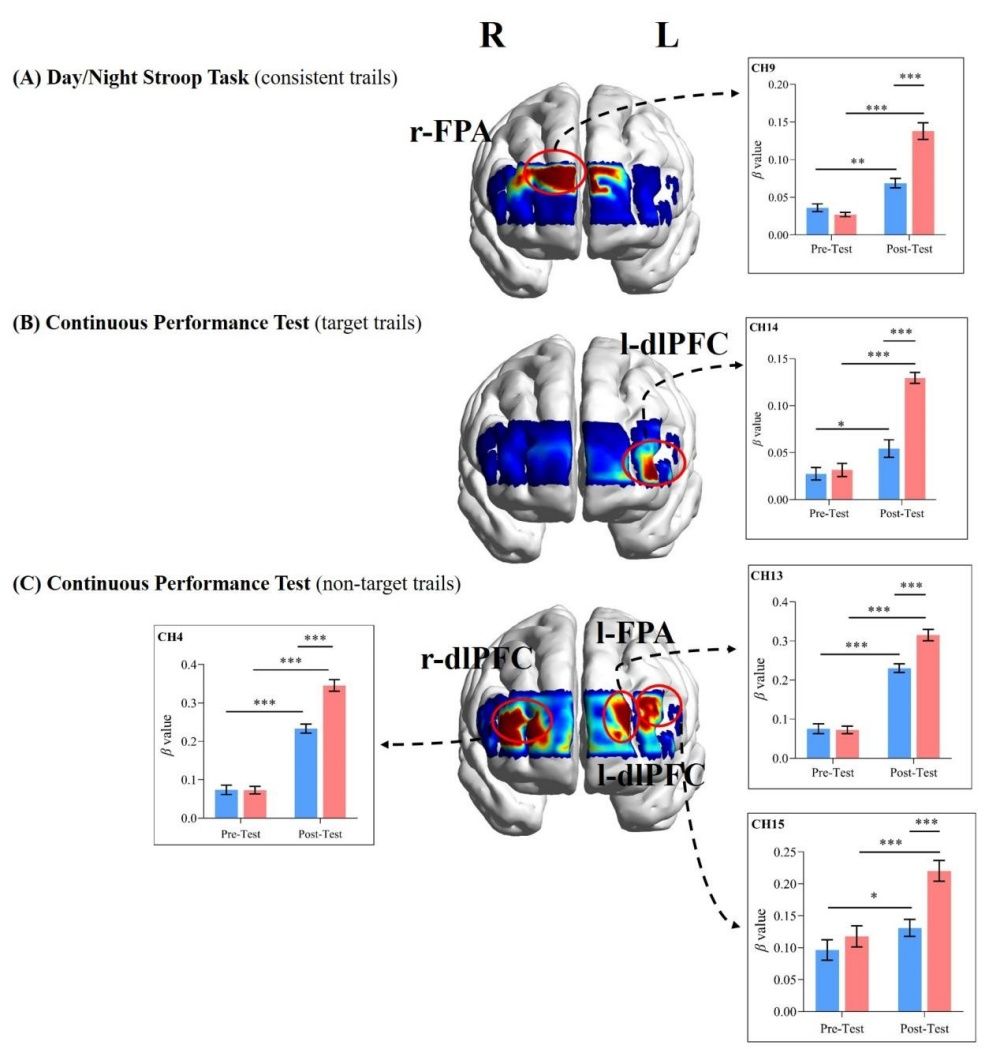 图4 被试在前测和后测时完成电脑版Day/Night Stroop Task和Continuous Performance Test的PFC激活