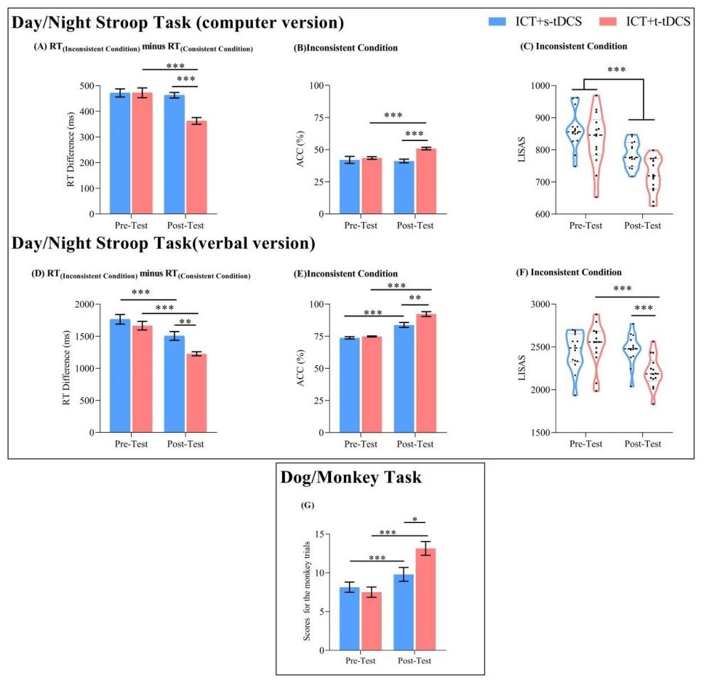 图1 电脑版和口头版Day/Night Stroop Task前测和后测的反应时之差、正确率和线性综合速度-准确度评分(图A-F);