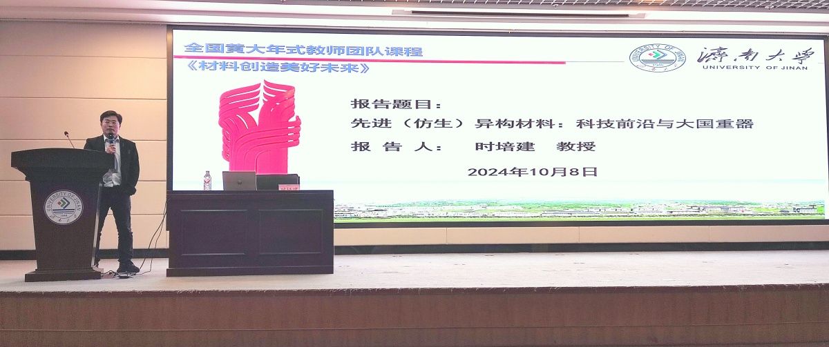 10月8日,全国高校黄大年式教学团队2024系列课程《材料创造美好未来》第二讲在第一学术报告厅举行。上海大学教授、香港城市大学助理研究员、我校优秀校友时培建为材料科学与工程学院师生带来一场题为《先进(仿生)异构材料:科技前沿与大国重器》的课程讲座。讲座由材料科学与工程学院副院长段广彬主持,300余名师生聆听了讲座。