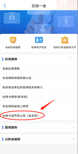 注册完成后在首页左上角的站点选择中选中“省本级”,点击最下方“服务”,进入“五险一金”模块,选择社保卡证件照上传(省本级),按要求上传成功即可。