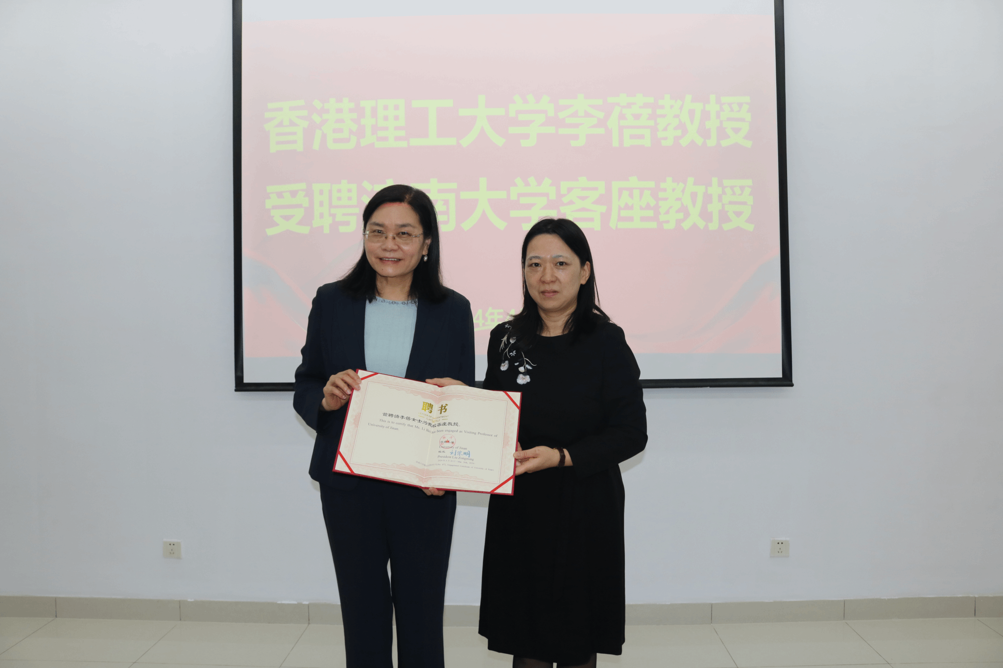 2024年4月22日,香港理工大学李蓓教授应邀来校交流,并作学术报告。报告会在逸夫楼A111会议室举行,济南大学副校长商华出席报告会并为李蓓教授颁发济南大学客座教授聘书。报告会由智能材料与工程研究院院长蒋绪川教授主持,智能材料与工程研究院以及相关学院的师生参加了报告会。